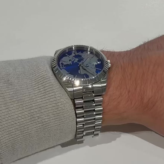 The design, with its silver-colored world map and navy blue dial, reflects a boundless mindset: for those who look beyond their own hometown.